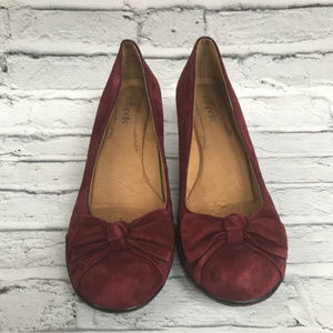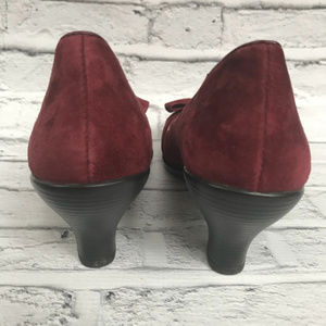 Softspots maroon suede heels. Feature a round toe and bow detail. Simply, supremely, superbly, sensationally, sinfully, softly comfortable. Size 7.5W. Heel height approximately 3”. Bundle and Save!