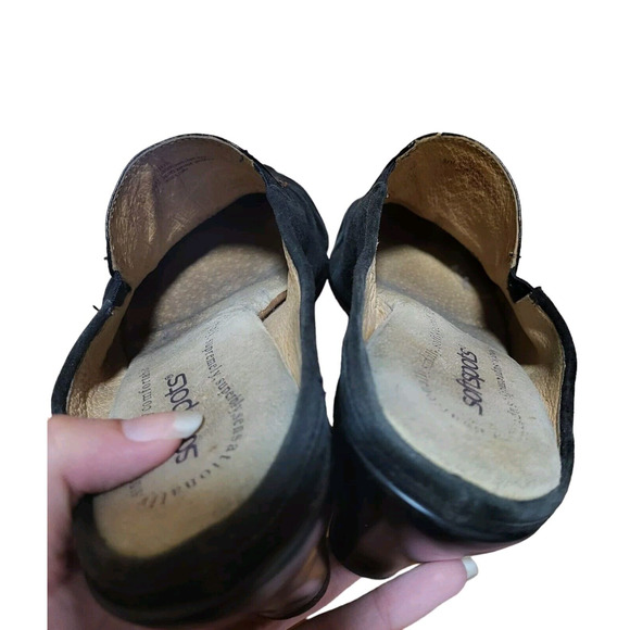 Step into comfort and style with these Softspots Clogs. The paisley pattern on the black leather upper adds a touch of vintage charm, while the slip-on closure makes them easy to wear. These shoes feature a mid-height heel and cushioned insole for all-day comfort. The suede outsole and leather lining material provide durability and breathability. Available in UK size 7.5, US size 9.5, and EU size 41, these clogs are perfect for any casual occasion.