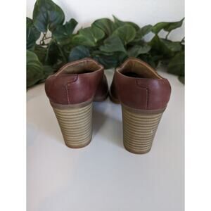 Features and description: Keya mules; heels; slip on; leather; stacked block heel; brown; narrow width