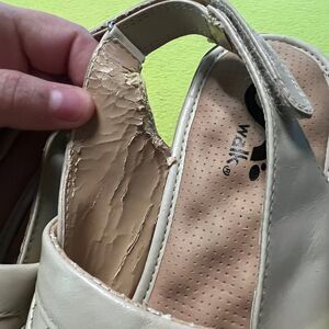 Light beige color. Woven design. Adjustable slingback Velcro strap on back. Leather material. Brush suede lining. Specials sold.