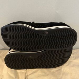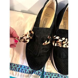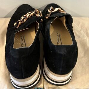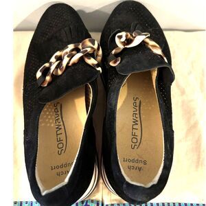 Softwaves Cadie Slip-On Platform Sneaker in black suede. A very comfortable and high quality shoe perfect for long days on your feet. The shoes do have a broken front buckle, which can be seen in the 3rd picture. A cobbler could fix the buckle and/or the buckles could be removed. Besides the buckle, she shoes are like new. Retail is $280!