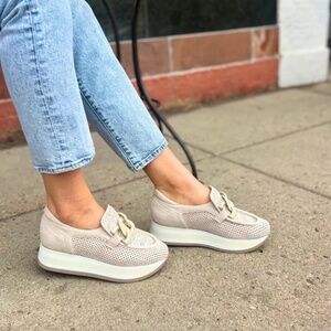 Perforated suede upper with raffia and chain detail