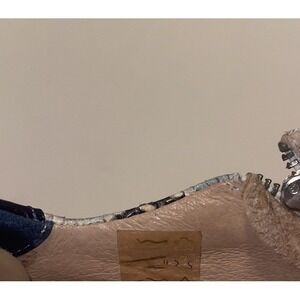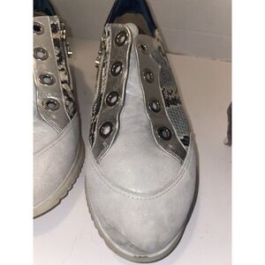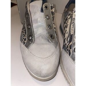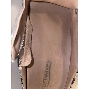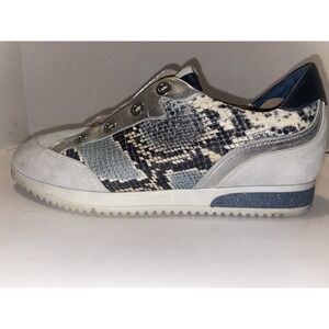 The Softwaves Women's Python Print Sneaker in size 8 offers a stylish and comfortable option for casual wear. Featuring arch support and a leather upper, these sneakers provide both comfort and design elements that are practical for everyday wear. The blue and beige color scheme and lace-free design make them a versatile and easy-to-wear option for any outfit. There is a place on the inside leather heel that is torn but still intact. Pictured.