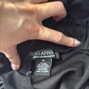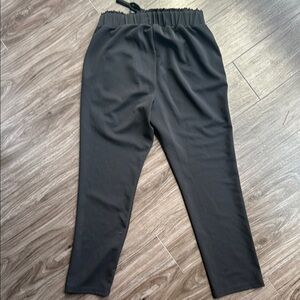 Stylish black trousers with elastic waistband. Features a drawstring tie and side pockets. Perfect for casual or formal wear.