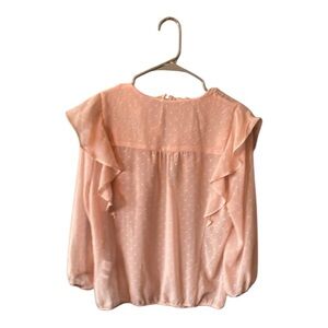 This is a stunning Soho by New York & Co shirt. The blush pink color, the polka dot pattern, the sheer material, tie neckline, and ruffle accents add a touch of classic charm to this blouse. The long balloon sleeves make it easy to wear and breathable for the summer and spring seasons.