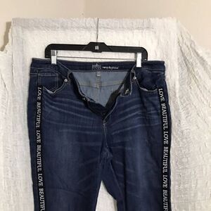 "Love Beautiful " side phrasing detail design. Medium to dark wash denim jeans. Stretchy. Pre-owned in good condition. Please refer to pictures for best description and condition verification.