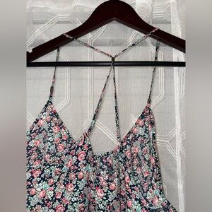 This breezy floral tank top from Soho Jeans is perfect for spring and summer! Features a navy blue base with a pink and mint floral pattern, adjustable spaghetti straps, and a flowy, relaxed fit. Great for layering or wearing on its own with jeans or shorts.