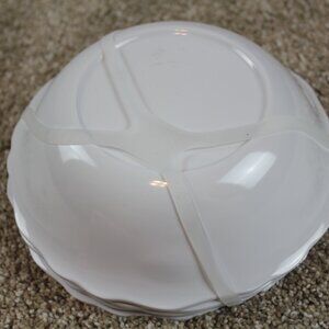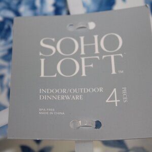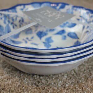 Pretty 4-piece set of Blue Rose melamine cereal bowls by the brand Soho Loft. They are brand new in packaging. Dishwasher safe on top rack only. They are not micowave safe. Measure 7.25" across at widest point and just under 2" tall. So beautiful! Rare and hard to find!