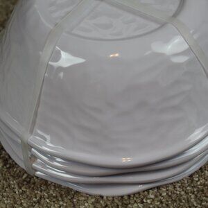 Pretty 4-piece set of melamine bowls by the brand Soho Loft. They are brand new in packaging. Dishwasher safe. They are not microwave safe. Measure about 8" across and 2.5" tall. So beautiful! Rare and hard to find!
