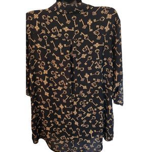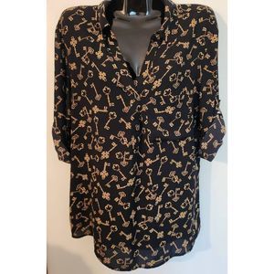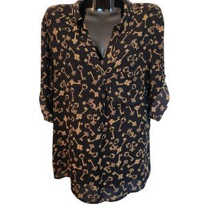 Soho NYCompany Black and Gold Key Print Tunic Blouse adjustable 3/4 Sleeve V-neck Top Size L