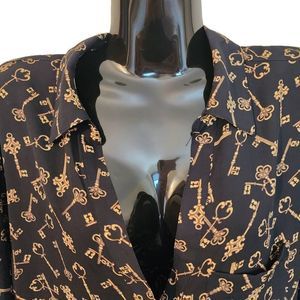 Soho NYCompany Black and Gold Key Print Tunic Blouse adjustable 3/4 Sleeve V-nec