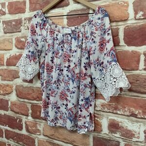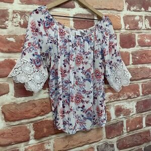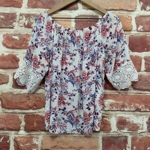 ▪️ Women's top: Scoop neckline, pullover, Bohemian style floral pattern, and embroidered crochet trimmed short sleeves. Pre-owned. Wear it with your favorite pants!