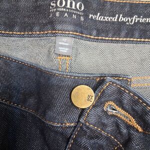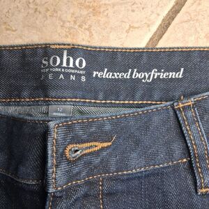 The Soho Relaxed Boyfriend Women's Jeans in size 12 feature an all-over floral embroidery pattern in blue, made of medium wash cotton denim. These jeans have a relaxed fit with a zip and button closure, and a 29-inch inseam. The boyfriend style is accented with shaping and belted features, making it a stylish and comfortable choice for women looking for a unique denim option.
