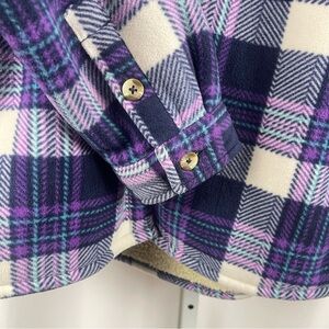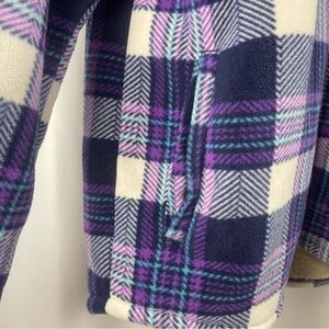 Cozy plaid jacket with sherpa lining. Features a stylish purple and black check pattern.