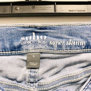 Soho Jeans Women’s Blue Ripped Distressed Super Skinny Jeans, size 6. Approximate measurements: waist 13.5”, length 36”. Flaw: please see the last picture, on the back side approximately behind the knee there are two white spots. These jeans can be cut and used as jean shorts for the summer. ***Bundle to save on shipping and get 10% discount. The discount will appear automatically in your basket if you have 2+ items from my closet.