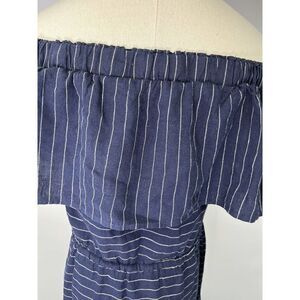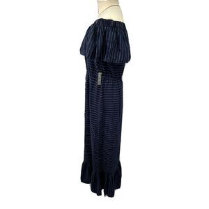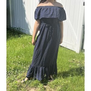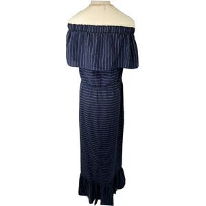 New with tags. Soho New York & Company Women's size XS. Navy Blue with white thin stripes. Linen blend material. Wide ruffle hem. Off The Shoulder Maxi Dress Size XS New with tags. Has been professionally pressed. Measurements in photos. No rips, holes, or stains. Comes from smoke free environment.