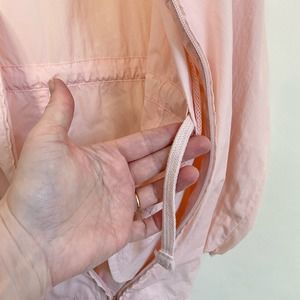 Soie light pink lightweight windbreaker jacket. White text on the front chest & on the back- "Positive & Unusual Style". Hood, pockets, waist that can be cinched in. Marked a size Juniors 17 in foreign sizing- seem best for a US S/M See measurements for a good fit.