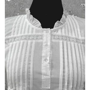 Experience timeless grace with this SoieRose Victorian nightgown, crafted from 100% soft cotton featuring a delicate white tone subtly patterned with faint blue dotted texture. The gown highlights elegant pintuck detailing on the bodice, refined lace inserts, and ruffled cuffs for an authentic period-inspired silhouette. Designed for pure comfort and sophistication, this piece is ideal for peaceful nights or relaxed mornings.