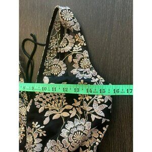 Step into a world of elegance with this stunning Soieblu maxi dress. The intricate pink/gold floral embroidery set against a black background creates a captivating contrast, while the deep V-back with tie & zipper closure adds a touch of allure. Experience the charm and sophistication of this beautifully crafted dress.