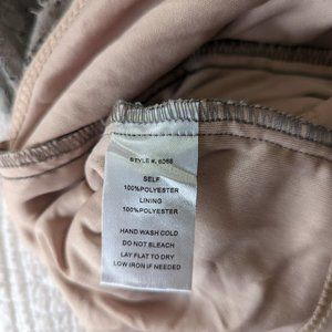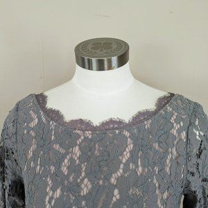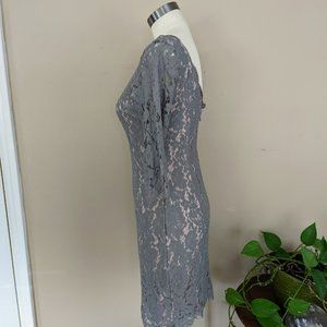 Gorgeous lace dress by Soieblu. Gray floral pattern over nude lining. Zip closure with exposed back. Scalloped lace edges and 3/4 length sleeves. Beautiful dress for cocktail parties and weddings. Size small with flat lay measurements of 15" pit to pit and 33" length. EUC with no wear, tears or stains.