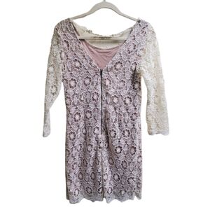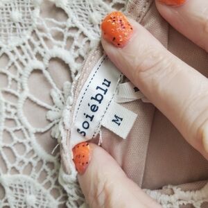Creamy white crochet/lace on the outside. Tan liner on the inside.