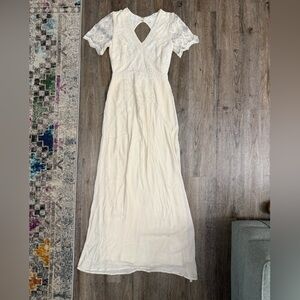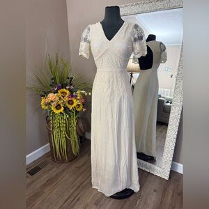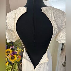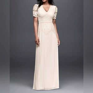 This crinkled rayon sheath's vintage feel comes from its delicate mix of appliqued mesh and lace panels; an open keyhole back adds a modern touch.