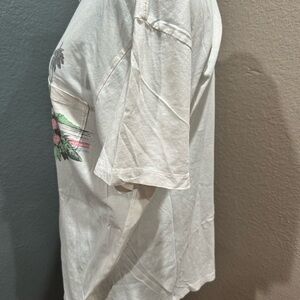 White tee with floral and palm tree graphic. Short sleeves. Casual and stylish.
