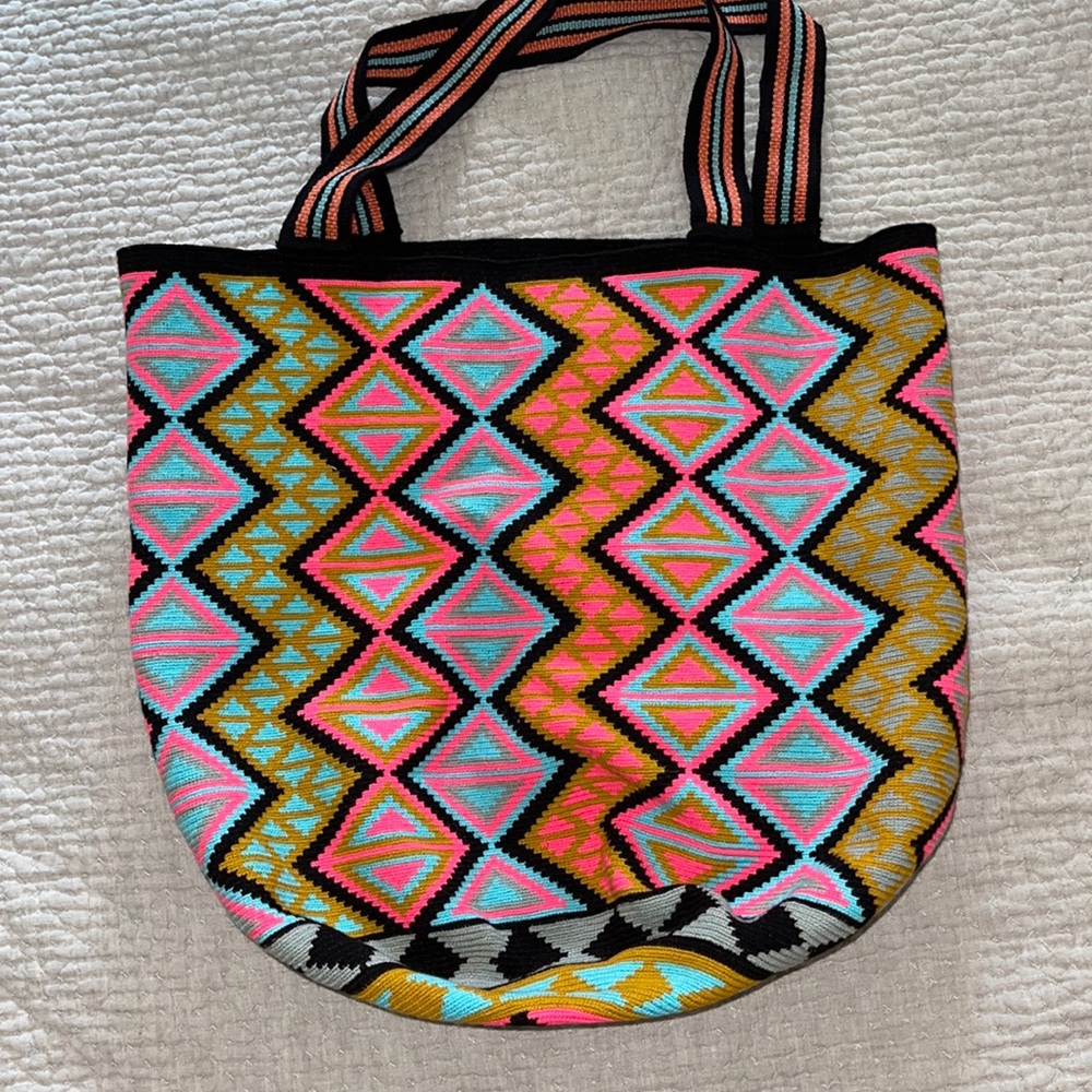 Like new tote. Measurements are shown in photos. Perfect for beach, farmers market, work! Really anything. hot pink turquoise mustard black and grey are main colors. Looks like it would weigh a lot but doesn’t.
