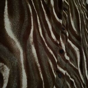 Women's Button Up Blouse, Short Sleeve, Animal Print, Embellished Back. 96% Rayon, 4% Spandex. Dry Clean.