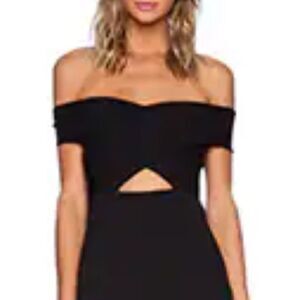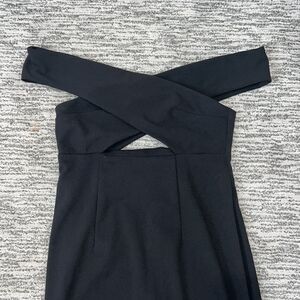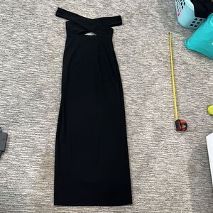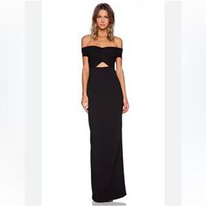 Long length classic formal black maxi dress with back slit. Off the shoulder and peekaboo cutouts that give this elegant LBD something to talk about!