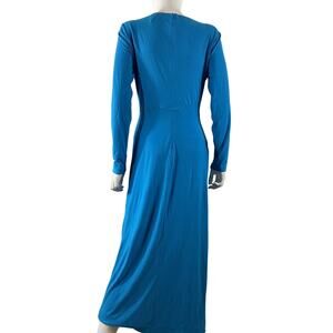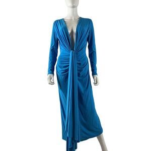 Solace London 'Lorena' Blue Polyester Midi Dress Size 6: unlined, hidden back zipper closure, ruched front with knot draped fabric, crepe fabric, measurements: 16 inch bust x 51.5 inch length.