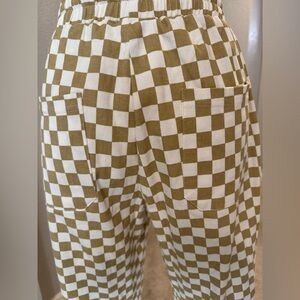 Solai The Label Cream & Tan Checkered Cotton Track Pants. These are a great comfortable yet fun addition for an easygoing attire day, but also looking pulled together with a bit of playfulness.
