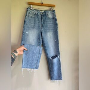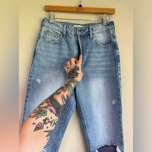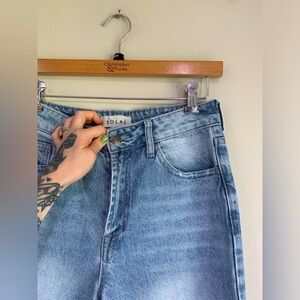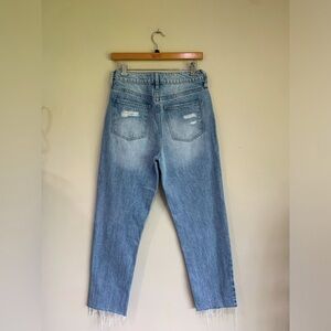Solai light wash denim- 100% cotton, with the perfect amount of distressing, a high rise fit & a tapered leg style. The ultimate “mom jeans”. No longer sold online, retailed for $108.