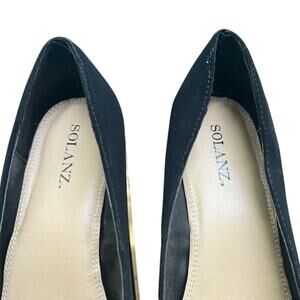 Women’s Solanz Trudie Wedges in classic black, size 9M. Designed with a sleek faux suede upper, these wedges feature a comfortable round toe and a stable 2.5-inch wedge heel that offers both height and support. Ideal for both professional and casual settings, they transition seamlessly from day to night. Gently used and worn once, these shoes remain in very good, like-new condition with minimal signs of wear on the soles.