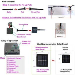🧿Easy to Operate & Install: Simple operation with two switches (Power On/Off button and Mode button). Easily to install the solar panel to the stake and hammered the stake into where could charge the panel easily. 8 Different Modes setup(Flashing, twinkle, waves, sequential, slow-glow, chasing, slow fade and steady on.). Press Mode Button to select 8 different modes to satisfy your favorite mode per different scenarios you wanna.