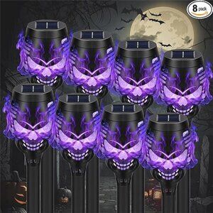 Solar Halloween Decorations Outdoor, 8 Pack Spooky Skulls Solar Torch Flame