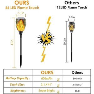🧿2024 NEW Upgraded 41IN Solar Tiki Torches with Flickering Flame : 1, Super Larger Size with upgraded flame, these 66LED bulbs cast a soft vivid "flickering flame". 2, Quick charging technology with larger size solar panel. 3, Longer Working Time & More Durable. 4, IP65 waterproof performance.