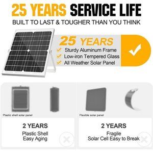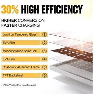 🧿【Built to Last】 Low-iron tempered glass surface and corrosion-resistant aluminum frame, make this solar panel 100% waterproof and rustproof, and provide the prolonged lifespan up to 25 years. This 12V solar panel can withstand all weather conditions such as sandstorm, strong wind, thunderstorm, blizzard, hail, etc. It can withstand up to 2400Pa wind pressure and 5400Pa snow load.