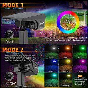🧿Multiple Color Solar Landscape Light & solar color spot lights outdoor: The RGB solar spotlights provide various color Change options in both dynamic and static status including 8 fixed color modes and 1 automatic color change mode. Short press the power button, and the light will turn and enter color cycling mode. Short press the power button again, and the light will switch to 8 fixed color modes. The 8 colors in turn: Cool White, Red, Green, Blue, Yellow, Purple, Cyan, and Rainbow.