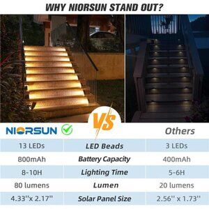 🧿【IP67 Full Waterproof & Sturdy Construction】Constructed from tough, high-strength ABS material with a fully sealed design, NIORSUN solar lights for steps carry an IP67 rating for ultimate dust and water resistance. Built to be resilient, the outdoor step lights stand up to harsh weather including heavy rain, snow, and frost for reliable year-round performance.