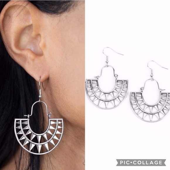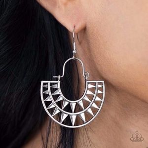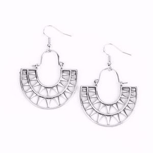 Detail ~ Two rows of shiny triangular frames curve into a stacked sunburst pattern, creating a radiant lure at the bottom of a dainty wire fitting. Earring attaches to a standard fishhook fitting.