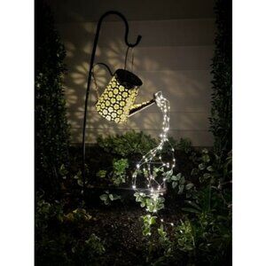 Creative Garden DIY LED Lights:Solar watering can with cascading lights have 6 Copper string lights 25.9in(75cm) long string with 90 super bright leds.The Outdoor Solar Watering Can Garden Lights can be hung on the porch, tree or use the included 32 inch shepherd hook to hung or placed on the table or patios to show charming retro openworked pattern.