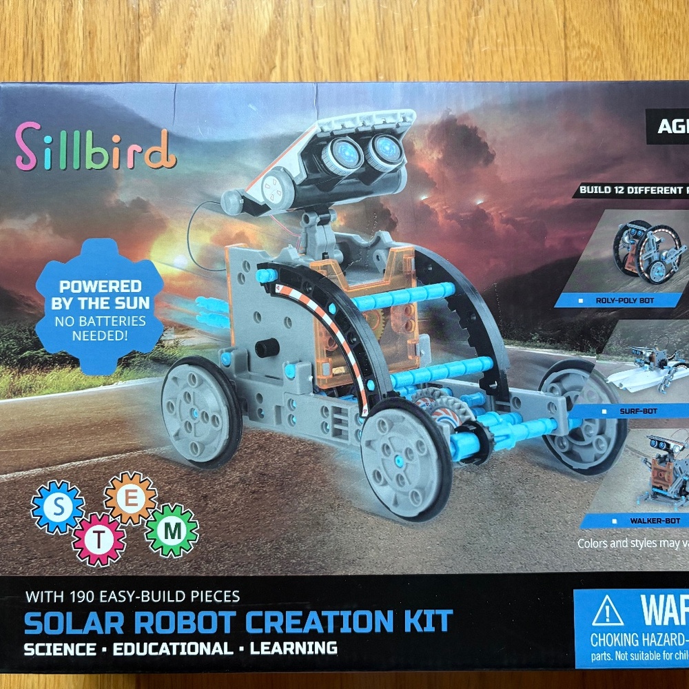 Solar powered robot. 12 different choices of robot to build. 190 pieces. Brand- Sillbird. Ages 8+