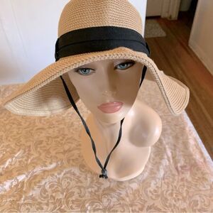 Solar Escape Packable Floppy Hat Cream w/ Black Hatband Drawstring OSFA Gorgeous
