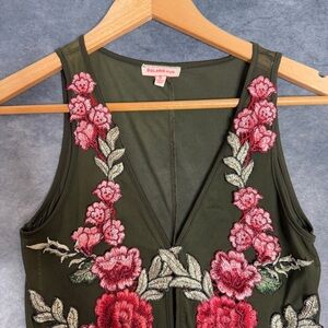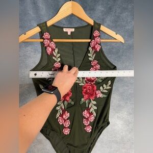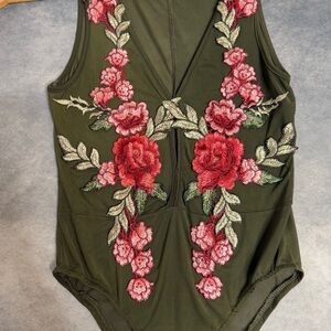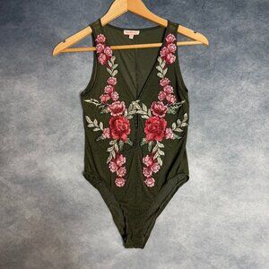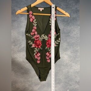 Solaris Green Red Pink Floral Embroidery Sheer Mesh Snap Button Bodysuit Size S
