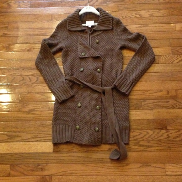 Long milk chocolate brown zip and button sweater coat. Only worn twice. Sleeves are nice and long. Cloth belt gives it a classic look.