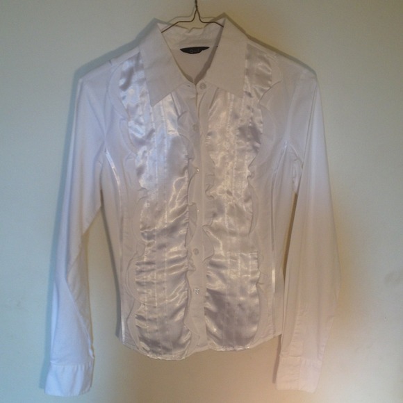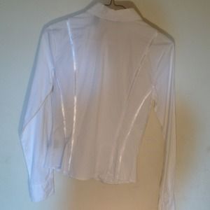 This is a really cute white tuxedo style long sleeve blouse. No staines, tapered at the sides for a fitted look.