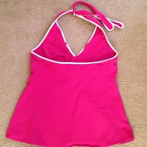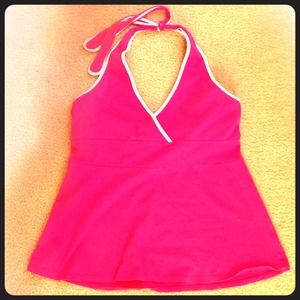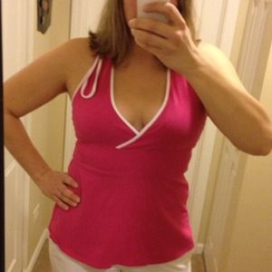 This is a Moda International (tag has been cut), tie halter top! Very figure flattering. The white trim really makes the pink color pop, and comments white bottoms of your choosing very nicely!! 95% polyester, 5% spandex.