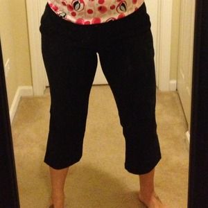 This is a pair of black capri's, made out of 77% rayon, 20% nylon, and 3% spandex. They are very comfortable, have a nice feel and stretch to them. These should never fade in color!!