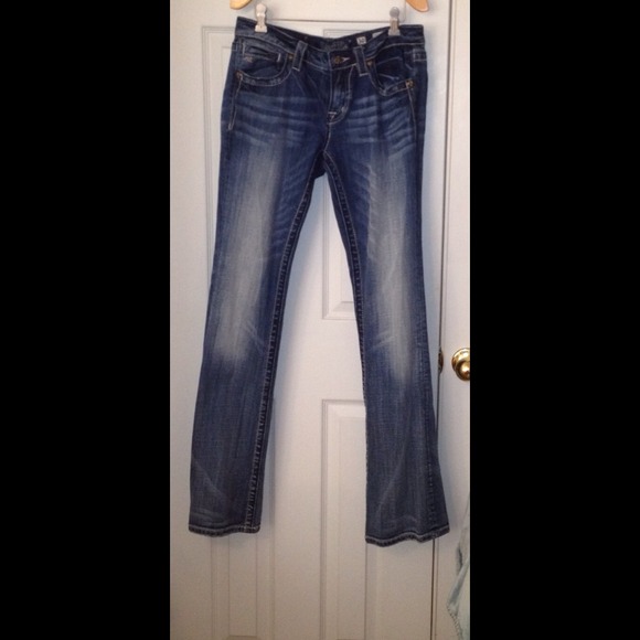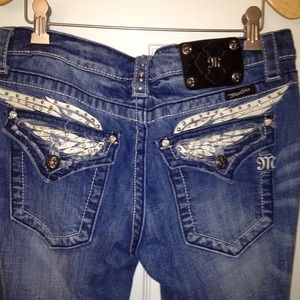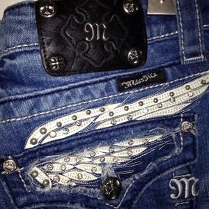 Size 30 33" inseam medium wash denim with blinged out wings on back pocket. Worn once before 30 year spread. These hips don't lie and unfortunately will never be this size again. :(